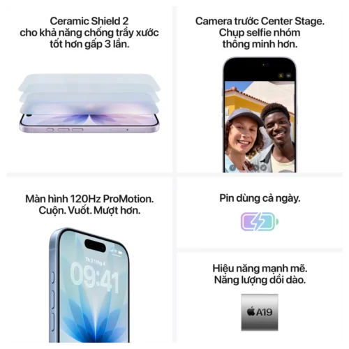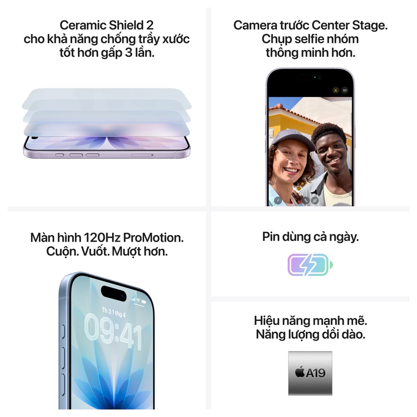 Điểm nổi bật của chip A19 trên iPhone 17 còn nằm ở khả năng tối ưu năng lượng. Với tiến trình 3nm tiên tiến, chip vừa mạnh mẽ vừa tiết kiệm pin, kéo dài thời gian sử dụng so với các thế hệ trước. Đây là yếu tố quan trọng, đặc biệt với người dùng bận rộn cần một thiết bị luôn hoạt động trơn tru cả ngày dài.