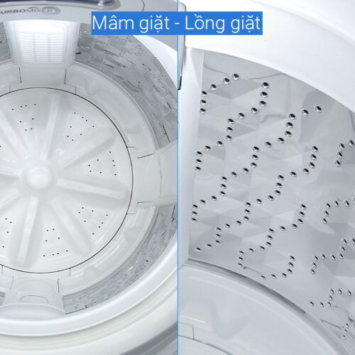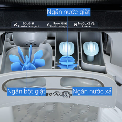 Hộp chứa Turbo Mixer sẽ hoà tan chất giặt tẩy và đưa vào lồng giặt, kết hợp với mâm giặt quay tạo thành hàng triệu bọt khí li ti, thẩm thấu nhanh trên quần áo. Nhờ đó giúp sạch vết bẩn và tránh tình trạng cặn bột giặt thừa trên vải.